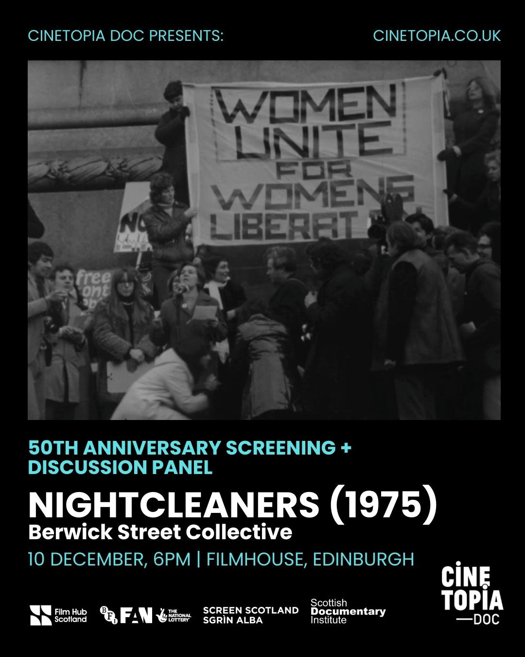 EDINBURGH: Cinetopia DOC: Nightcleaners + Discussion Panel, 50th anniversary screening | 2025 marks the 50th anniversary of Nightcleaners (Part 1) (1975), a landmark documentary and work of political art that captures the struggles of women working as night cleaners in Londonâs office buildings during the early 1970s and their early attempts to unionise. Followed by a hybrid panel discussion featuring members of the Berwick Street Collective. We will be joined in person by Humphrey Trevelyan, and via zoom: James Scott and artist Mary Kelly (who was also a member of the Cleaners Action Group). / Filmhouse | 10 December, 6pm
